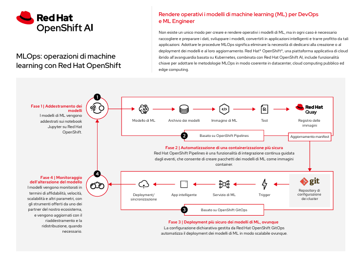 Red Hat OpenShift include funzionalità chiave per supportare le operazioni di machine learning in modo coerente tra datacenter, cloud computing pubblico ed edge computing.